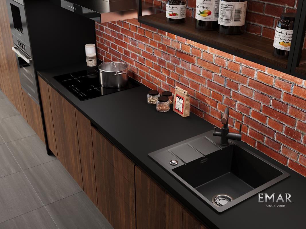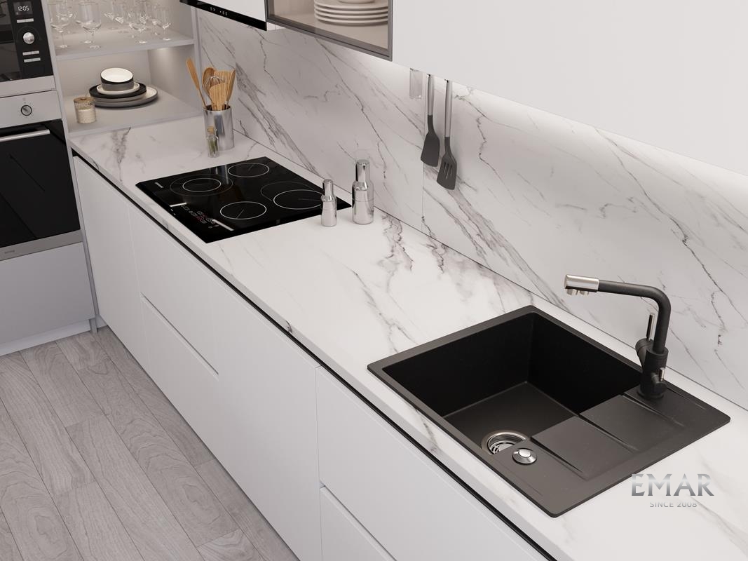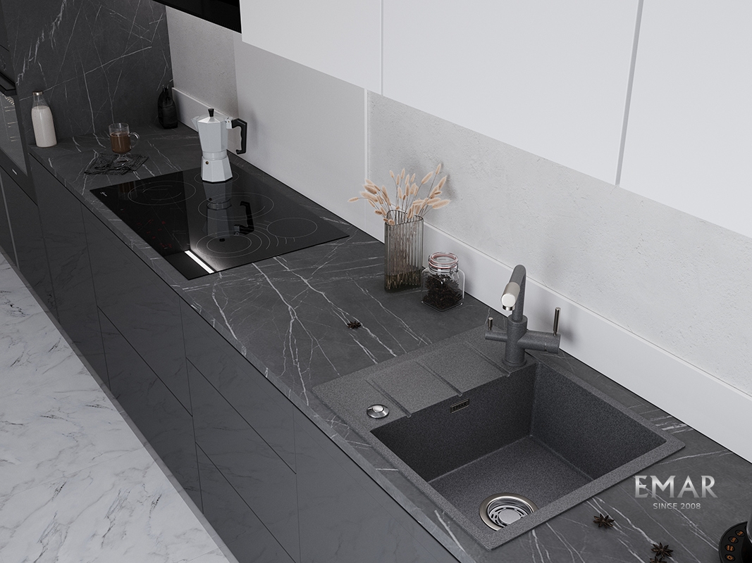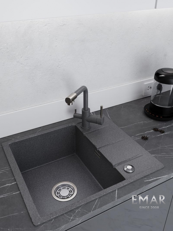 Кухонные мойки EMAR QUARTZ на 78% состоят из измельченного кварца различных фракций и 22% связующих полиэфирных смол модифицированных метилметакрилатом.